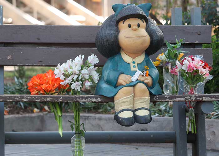 La estatua de Mafalda, la niña de pelo negro abultado que odia la sopa y ama a los Beatles, en el barrio histórico de San Telmo, en el centro de Buenos Aires, se llenó de flores de lectores que se acercaron a rendirle homenaje.
