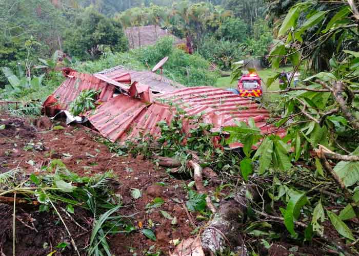 ?Terraplén sobre una vivienda en Agua Buena de Coto Brus. Al parecer dos adultos se encontraban dentro. Cuerpos de rescate trabajan en la zona.