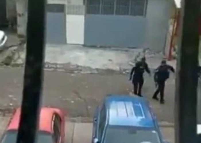 El perro se acercó a los policías, como todo animal ladró y es cuando uno de los tres uniformados le propinó una patada que hace que el animal se caiga y chille de dolor.