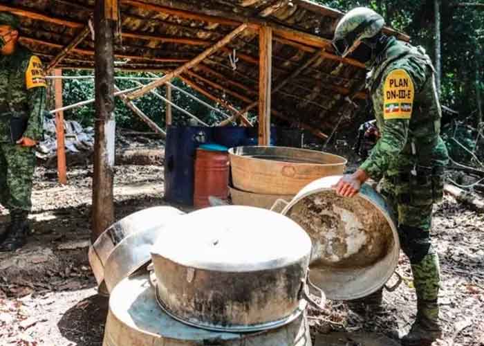 "Se encontraron entre el río Santiago y El Porvenir, seis plantíos de coca y un laboratorio rústico para el procesamiento de goma de opio y de la hoja de coca", dijo a los medios el teniente coronel Enrique Benítez Campoy.