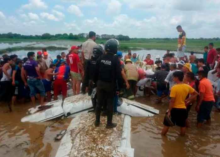 La Dirección de Aviación Civil adjuntó una fotografía en la que se aprecian los restos de la avioneta boca abajo sobre una superficie de agua y personal de la Policía y Bomberos durante las labores de reconocimiento, así como decenas de personas sobre la cabina y alas del aparato.