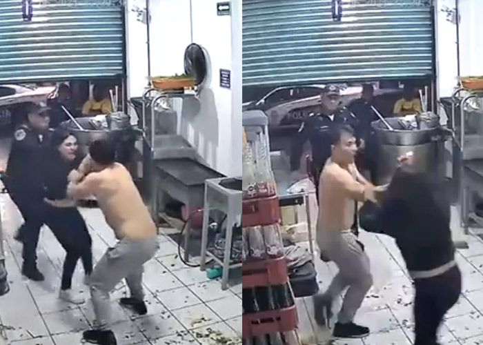 De la nada aparecen dos oficiales de la Secretaría de Seguridad Ciudadana que parecen llegar a calmar las cosas entre la pareja. Luego, en una serie de movimientos de la mujer se observa como toma un cuchillo y comienza a atacar a su pareja.