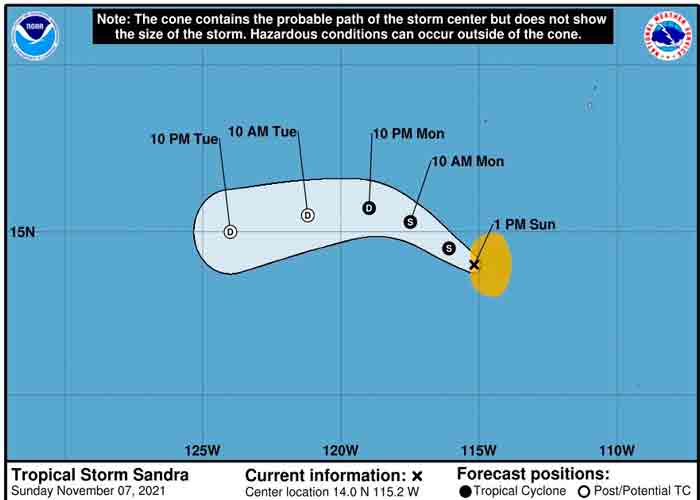 Por otra parte, en otro aviso, anunciaron, «se ha formado la Tormenta Tropical ‘Sandra‘ a partir de la Depresión Tropical ‘Diecinueve-E’. Su centro se localiza al sur-suroeste de Cabo San Lucas, B.C.S. No representa peligro para territorio mexicano«.