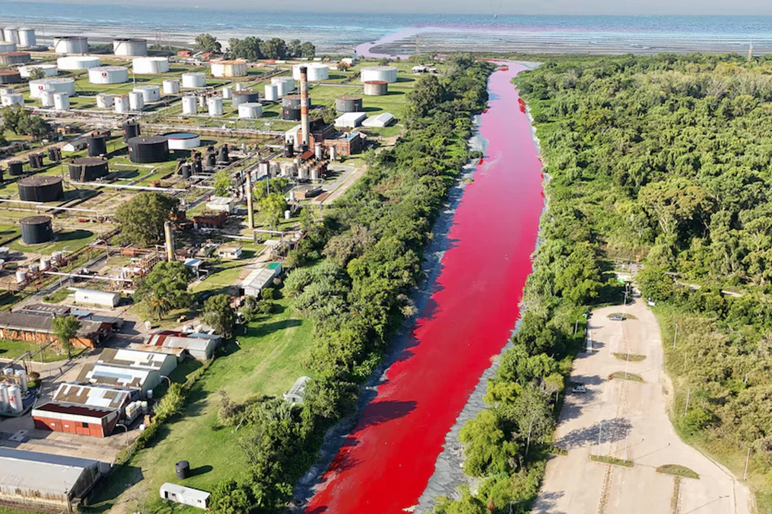 El arroyo Sarandí, ubicado en Buenos Aires, Argentina, ha adquirido un tono rojo. Los habitantes y medios locales especulan que esto podría deberse a la contaminación química procedente de las fábricas cercanas,… pic.twitter.com/pPB8751sir