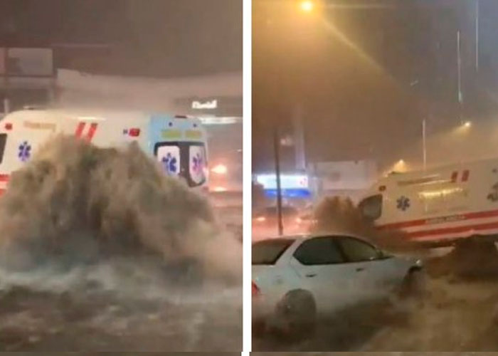 Era tanta la fuerza del agua que una ambulancia fue arrastrada como si fuese solo un juguete, afortunadamente, no había nadie dentro de la unidad mientras era arrastrada por la carretera.