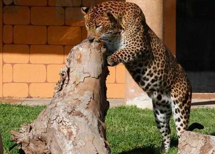 Por protocolo, la labor de alimentar se realiza cuando el leopardo se encuentra en la zona exterior, separada del lugar al que acceden los cuidadores.