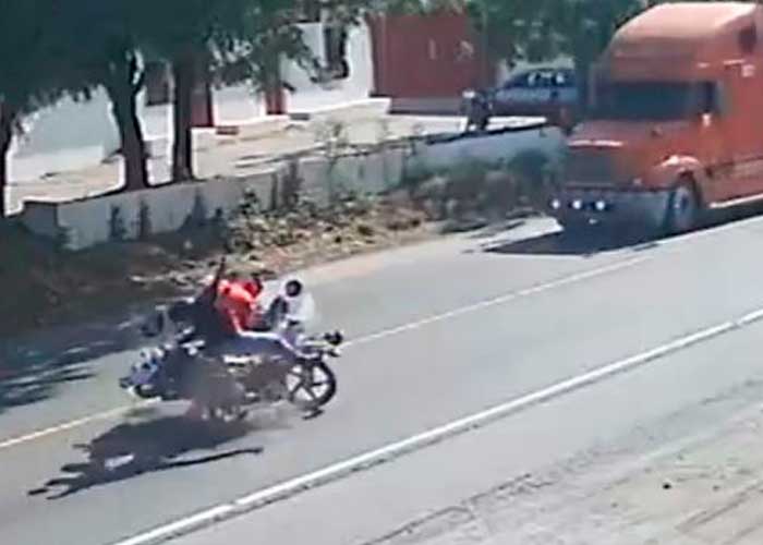 Según lo que se logra ver en el video que se viralizó en las redes sociales, un motociclista se incorpora a la carretera; pero va en sentido contrario cuando aparece otra motocicleta a todo velocidad con el conductor y su acompañante, que presuntamente es una mujer quien carga una mochila en los hombros; y en ese momento se impactan ambos vehículos.