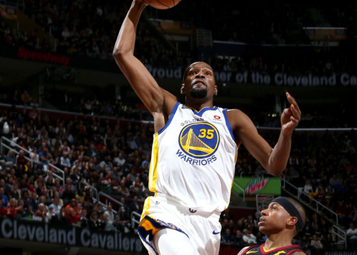 Durant anotó 32 puntos, Stephen Curry agregó 23 y Golden State logró su 13ra victoria seguida en cancha ajena, al derrotar el lunes 118-108 a sus adversarios en las últimas tres finales de la NBA, los Cavaliers de Cleveland, que ahora están en crisis.