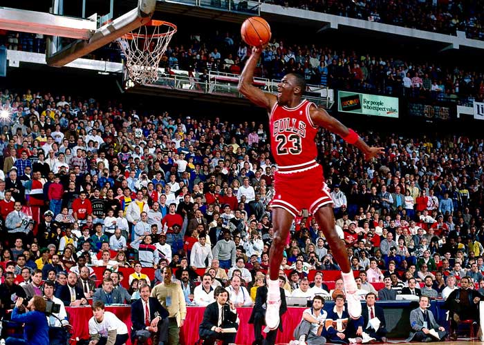 Cuando 1988 corría, un confiado Jordan tomó el balón en la duela del Estadio de Chicago ante su público y lo llevó con fiereza de un lado al otro para realizar una de las jugadas más recordadas en la historia de los concursos de clavadas de la Asociación Nacional de Baloncesto (NBA, por sus siglas en inglés).