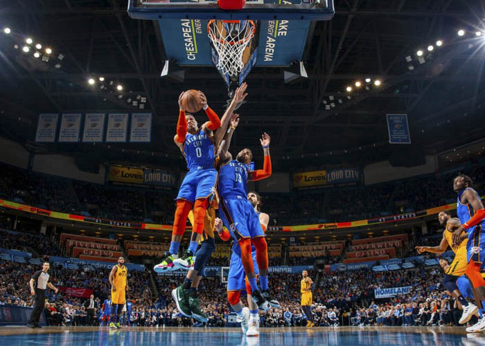 Russell Westbrook añadió 43 points, 15 rebotes y ocho asistencias, ayudando a Oklahoma City a sobrevivir una noche de 38 puntos de Donovan Mitchell.