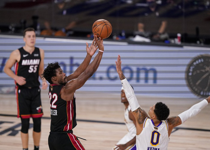 Butler finalizó con 40 puntos, 11 rebotes y 13 asistencias y el Heat venció el domingo 115-104 a los Lakers para reducir su desventaja en la serie 2-1, a pesar de no contar con los titulares Bam Adebayo y Goran Dragic, ausentes por lesiones.