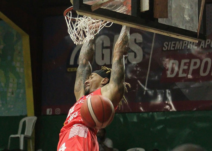 Jared Ruiz colgado en el aro de la cancha del Brigadista en la victoria del Real Estelí ante los Indígenas de Matagalpa en la LSB 2022. (Foto: Real Estelí)