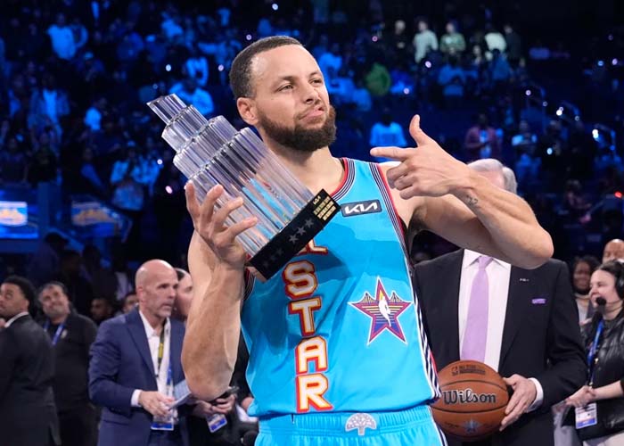 La última presentación previa al juego perteneció nada menos que a Stephen Curry. El gran trofeo de Jugador Más Valioso al final, Curry lo levantó alto en el aire también, en un cierre apropiado para su especial Juego de Estrellas en casa.