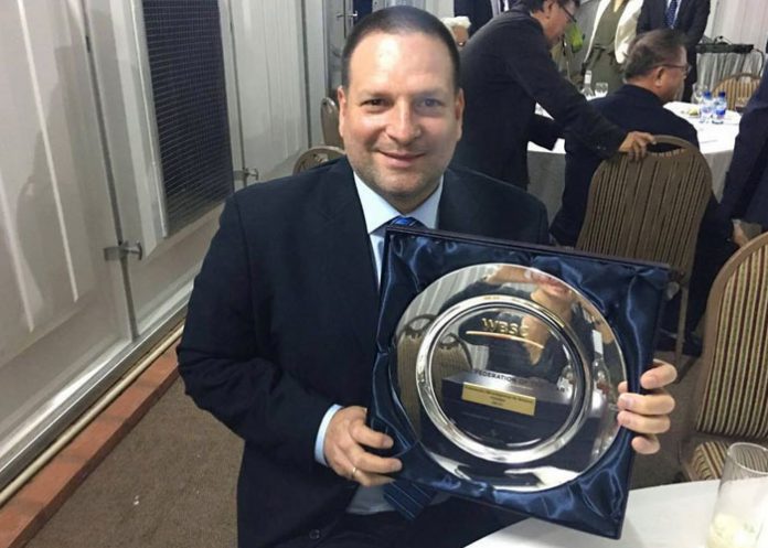 El Presidente de FENIBA, Cro. Nemesio Porras, quien se encuentra en Gaborone, capital de Bostwana, recibió la placa de distinción de las manos de Riccardo Fraccari, Presidente de la Confederación Mundial de Béisbol.