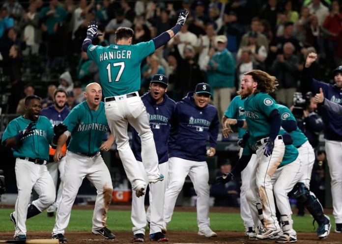 Haniger sacó la pelota entre los jardines central y derecho y su cuadrangular puso fin al partido luego de 4 horas 16 minutos. Haniger saltó sobre el plato entre numerosos compañeros. Fue su 12mo jonrón de la campaña y también recibió tres bases por bolas.