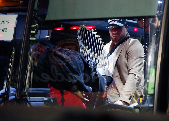 Los fanáticos comenzaron a vitorear cuando llegaron los autobuses y rugieron cuando el receptor puertorriqueño, Christian Vázquez, bajó del segundo autobús sosteniendo el trofeo.