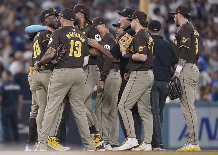 Para agregar algo a los animos caldeados, el abridor de los Dodgers, Jack Flaherty, golpeó a Fernando Tatis Jr. con un lanzamiento en la sexta entrada, y Profar intercambió palabras con el receptor de los Dodgers, Will Smith.