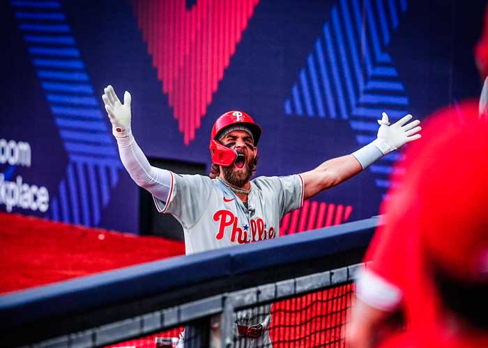 Después de un doble productor del dominicano Starling Marte en el primer episodio, Harper conectó palo de vuelta entera ante Sean Manaea (3-3) celebró al estilo fútbol frente al dugout de los Filis y para posteriormente gritar ”¡Me encanta el fútbol!” mientras chocaba los cinco con sus compañeros de equipo.