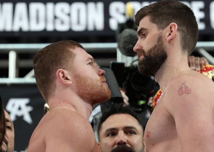 El ícono del boxeo mexicano Saúl "Canelo" Álvarez y el oriundo del Liverpool Rocky Fielding se vieron las caras durante la ceremonia de pesaje previa al combate que llevarán a cabo este sábado en el Madison Square Garden de Nueva York.