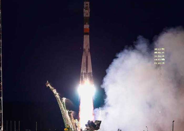 La Soyuz despegó a las 21.40 hora local (15.41 GMT) con ayuda de un cohete portador Soyuz FG de tres fases.