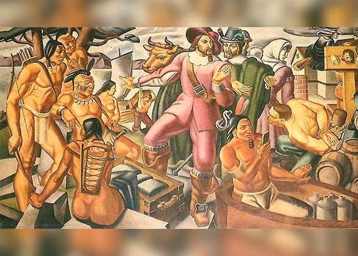 La escena retratada por el artista representa al colonizador inglés William Pynchon, quien en 1635 fundó el asentamiento que actualmente corresponde a la ciudad de Springfield.