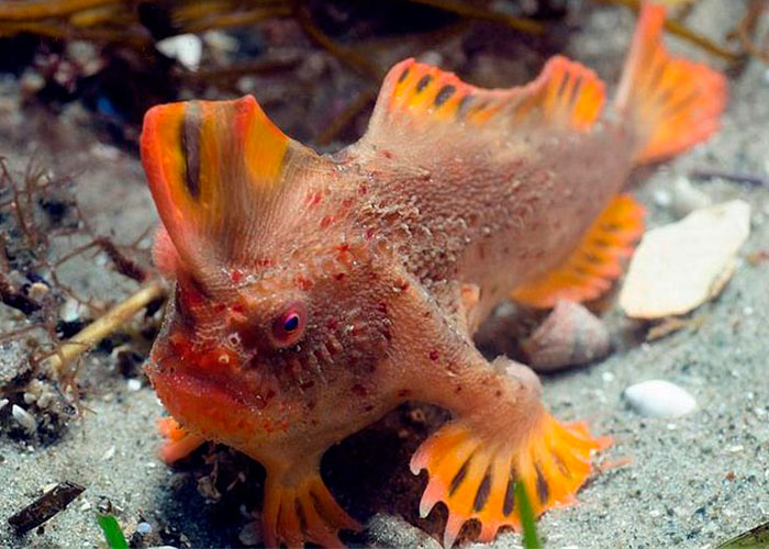 El pez de manos rojas tiene un cuerpo alargado y con protuberancias en forma de verrugas con el que se mueve lentamente por el lecho marino en busca de alimentos como crustáceos y gusanos, según el Ministerio del Ambiente de Australia.