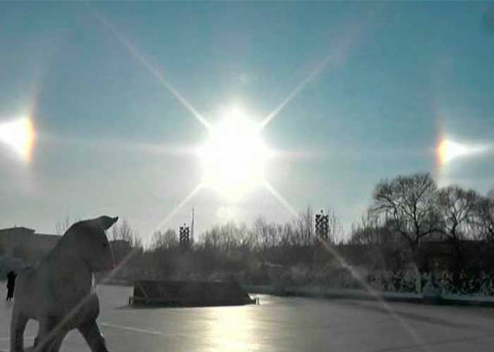 Harbin fue la ciudad testigo de este fenómeno meteorológico poco frecuente denominado parhelio. Esta maravilla surge cuando se produce la acumulación de partículas cristalinas de hielo en la atmósfera y se trata de un efecto óptico. Aunque solo hay un único sol, que en este caso aparecía en el medio, a los lados se producen dos focos luminosos que constituyen el reflejo de su luz en las partículas cristalinas.