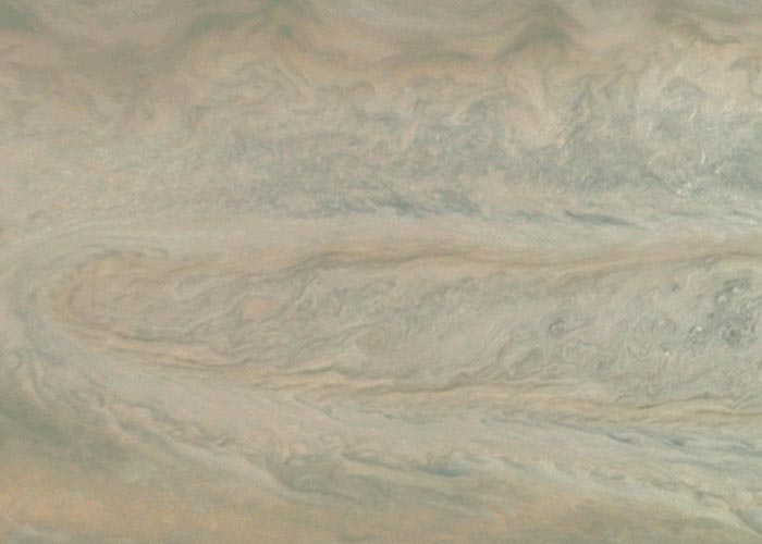 La animación es producto de la combinación de dos imágenes en color tomadas el 16 de diciembre de 2017 con una diferencia de 12 minutos por la sonda espacial Juno sobre el Cinturón Templado del Sur (STB, por sus siglas en inglés). Las dos fotos fueron captadas sucesivamente cuando la sonda se encontraba sobre a una distancia de 13.604 y de 30.970 kilómetros sobre las nubes del planeta.