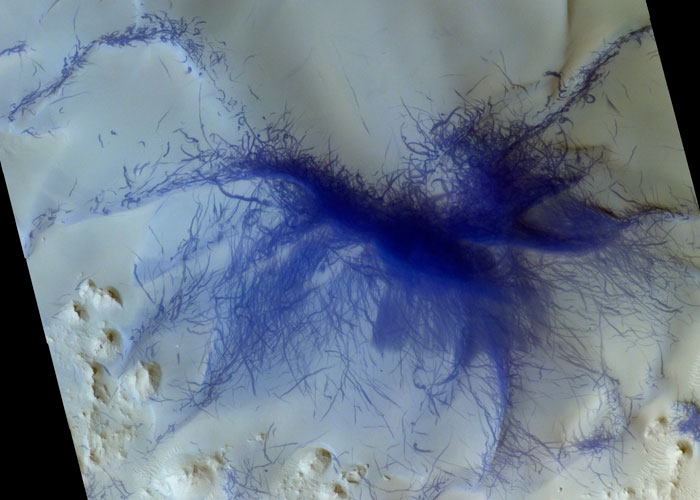 Cualquier elemento que se vislumbre sobre el planeta rojo es motivo de especulaciones y de investigación. Más aún cuando lo que se nos muestra en imagen es una especie de "araña gigante peluda azul", la cual ha circulado por redes sociales estos últimos días y que muchos usuarios han aprovechado para divagar sobre lo que podría ser, y es algo menos tenebroso de lo que pensáis.