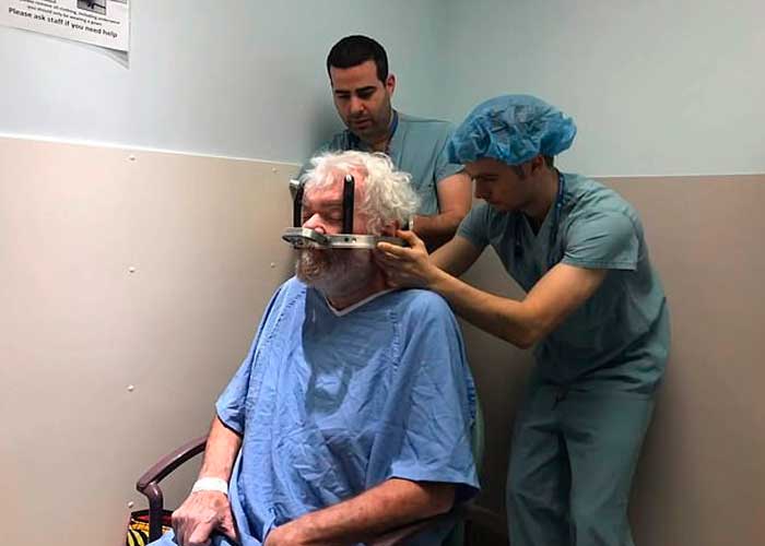 Los médicos perforaron agujeros en su cabeza e implantaron dos electrodos en su cerebro mientras aún estaba despierto durante la cirugía.