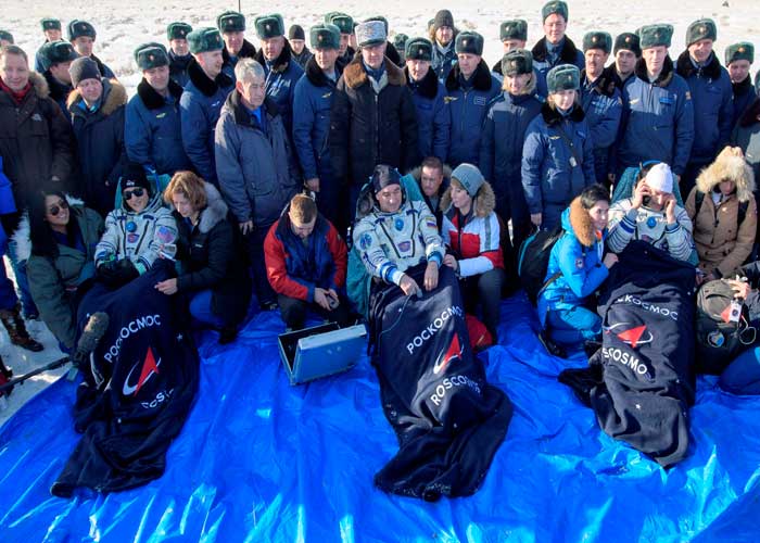 "El estado de la tripulación es satisfactorio", dijo el director de Roscosmos, Dmitri Rogozin, minutos después del aterrizaje de la cápsula, que mientras descendía sufrió fuertes ráfagas de viento.