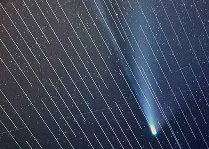 Los satélites Starlink colocados en órbita terrestre por SpaceX dentro de un proyecto de red global de banda ancha, han estropeado una imagen del cometa C/2020 F3 tomada esta semana por el astrofotógrafo Daniel López desde el Parque Nacional del Teide en las Islas Canarias.