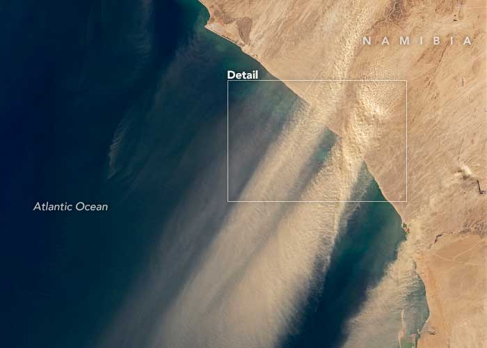 Imágenes captadas por el satélite Landsat 8, operado por la NASA y el Servicio Geológico de EE.UU., muestran una gran tormenta de polvo originada en el desierto de Namibia, de donde fluyen enormes lenguas de arena que penetran en el océano Atlántico.