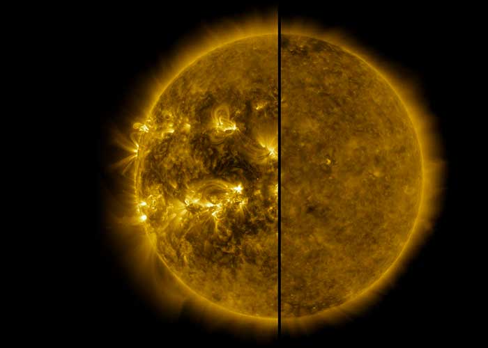 En una fotografía publicada en la cuenta de Instagram de la NASA, se puede ver como, durante el máximo solar (izquierda), salpican manchas solares y "su campo magnético, que impulsa la actividad solar, está tenso y enredado" y, en contraste, durante el mínimo solar (derecha), las manchas solares son pocas y distantes, y "el campo magnético del Sol está ordenado y relajado."