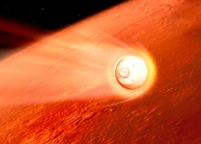 Todo comienza con el descenso de la cápsula donde viaja Perseverance desde la órbita marciana. El escudo térmico permite resistir el calor por fricción al contacto con la atmósfera del planeta rojo.