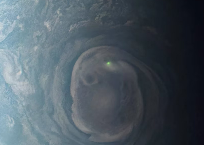 Este destello verdoso, de naturaleza espeluznante, ha sido identificado como un rayo surgido de una tormenta masiva que se retorcía cerca del polo norte del gigante gaseoso.