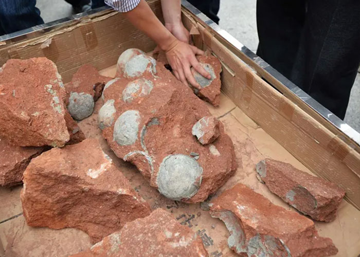 Quince huevos, con 80 millones de antigüedad se encontraron durante unos trabajos de construcción en el pueblo de Guanyintang de la ciudad de Yiwu, en la provincia oriental china, al este de China.