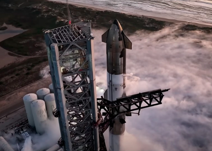 La grabación inicia con el despegue del cohete Starship, que fue diseñado para transportar a humanos a la Luna y Marte en un futuro. Posteriormente, se observa como el propulsor Super Heavy se separa exitosamente de la nave.