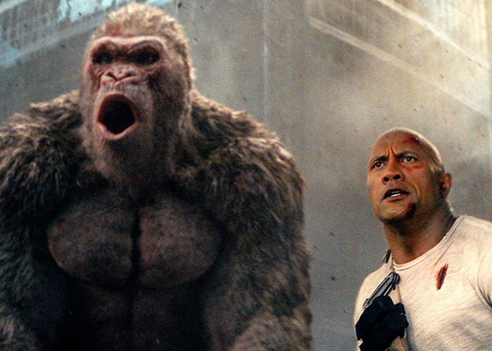 "Rampage" es protagonizada por Dwayne (The Rock) Johnson , quien interpreta a un experto en primates que se hace amigo de un gorila albino, el cual crece a un tamaño enorme después de un experimento deshonesto y luego se une al hombre para detener una invasión de monstruos .