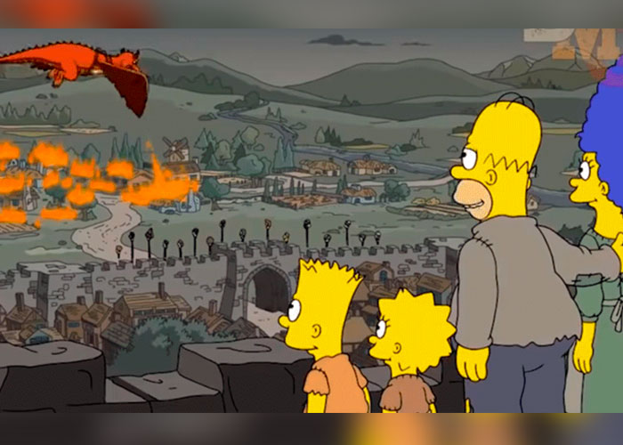 Pues resulta que en un episodio de 2017 llamado "The Serfons" y que tiene inspiración medieval, Marge, Homero, Lisa, Bart y Maggie viven en una villa medieval llamada "Springfieldia". Al final del episodio, un dragon rojo de poderoso aliento de fuego terminar por destruir este poblado, justo como ocurrió con King's Landing en el episodio 5 de la temporada de final de Game of Thrones, "The Bells".