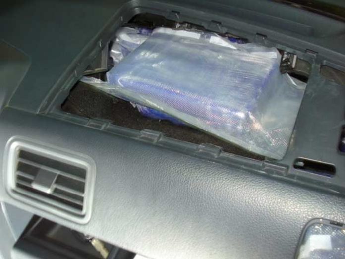 Elementos de la Policía Federal «aseguraron 23 paquetes (con peso de 25 kilos) que contenían polvo blanco con las características propias de la cocaína, los cuales iban ocultos en el área donde se despliega la bolsa de aire de un automóvil tipo sedán», informó la comisión en un comunicado.