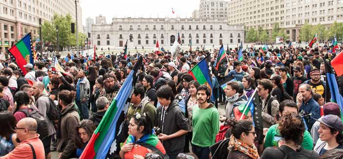 Coloridas banderas y lienzos pintados con consignas mapuches, dieron calidez a un largo recorrido que tuvo su punto máximo frente a la sede de gobierno 'La Moneda', donde algunos manifestantes incendiaron objetos y fueron inmediatamente reprimidos por las fuerzas del orden.