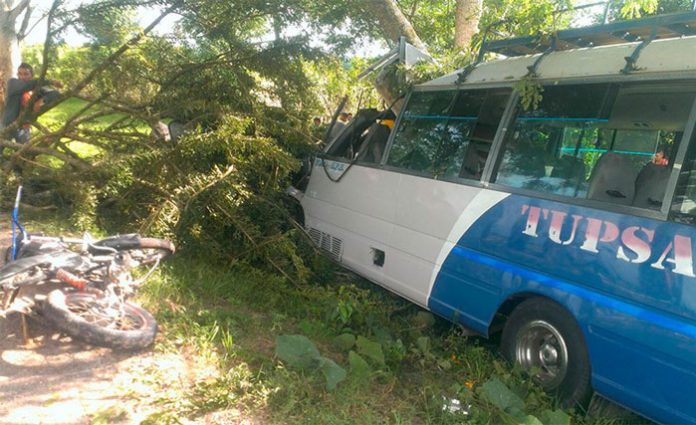 El conductor del bus, al ver la acción del motociclista quiso esquivarlo y giró el timón a su lado derecho, con tan mala suerte que impactó en un árbol, a la orilla de la calle.