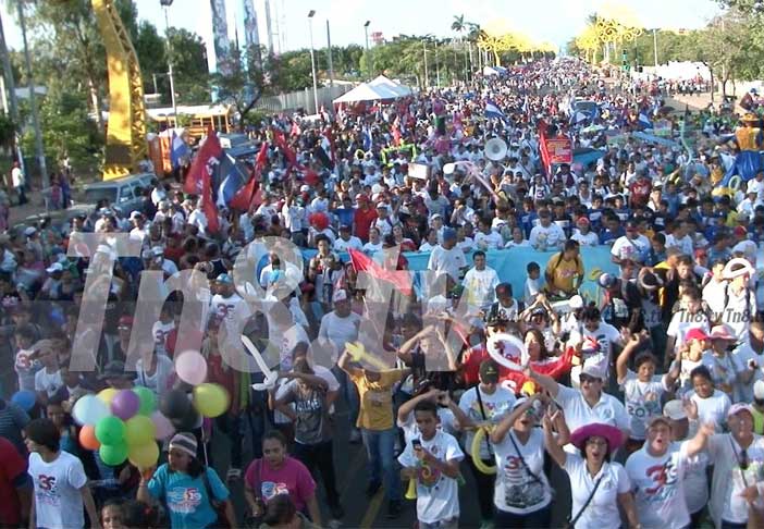 Ni el sol ni la distancia menguaron el ánimo de los miles de asistentes a la Caminata Unida Nicaragua Triunfa, que ratifica las encuestas que dan un contundente nivel de apoyo a los programas del Gobierno y sobretodo al Gran Canal, proyecto al que según ultimas encuestas tiene casi un 80% de aprobación y que los participantes aseguraron hoy está más cerca que nunca de ser una realidad.