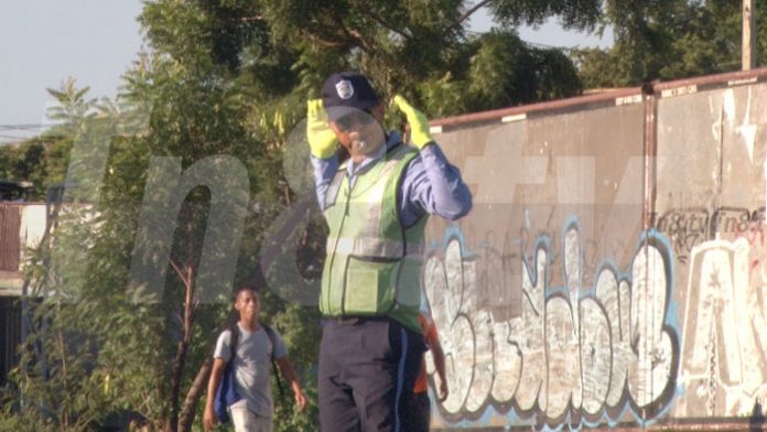 En los semáforos del Puente El Edén agentes de la brigada de Tránsito Managua distribuyen de manera uniforme la vía de acuerdo a la demanda de vehículos en los 4 puntos cardinales.