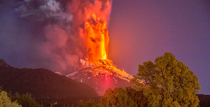 El volcán Villarrica es un estratovolcán chileno de 2450 mts midiendo desde la base, ubicado en los Andes meridionales. Su última explosión el 03 de marzo 2015, provocó que en las zonas cercanas se emitiera la alerta máxima restringiendo el acceso a la zona en radio de 10 km alrededor del cráter.
