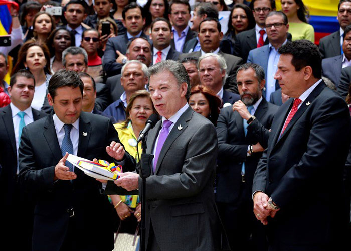 «Hoy damos un paso más hacia la paz, gracias al Congreso (…) el plebiscito es ahora una realidad. Acabo de firmar el decreto que lo convoca», dijo Santos en una alocución desde el palacio presidencial.