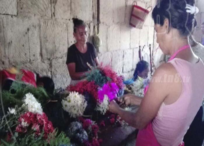 En la vivienda de la mayordoma de las flores María Gil González, desde tempranas horas los llamados alguaciles llegaron a dejar las flores que son armadas en ramilletes por mujeres, hombres y niños de todas las edades. Detalladamente son escogidos los colores y las más bonitas para armar lo que se le conoce como Sartas.