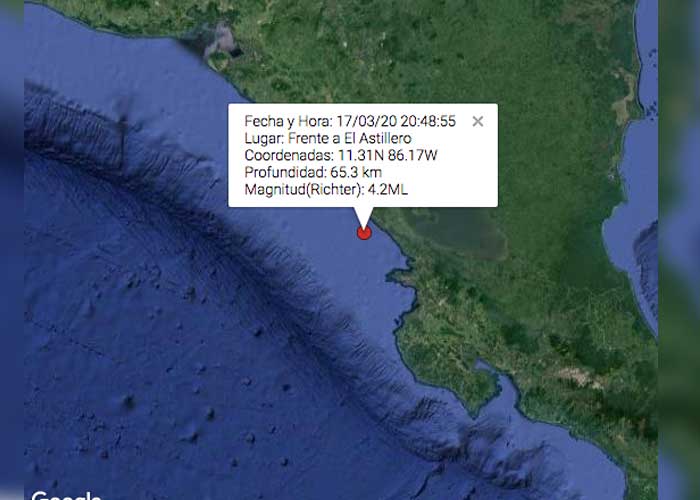 El evento tuvo una magnitud de 4,2 en la escala de Richter a una profundidad de 65,3 kilómetros y registrado exactamente frente a las costas del balneario de El Astillero en el departamento de Rivas, los municipios que reportaron con mayor intesidad el fenómeno fueorn San Juan del Sur, Tola, Rivas, Cárdenas y Belén