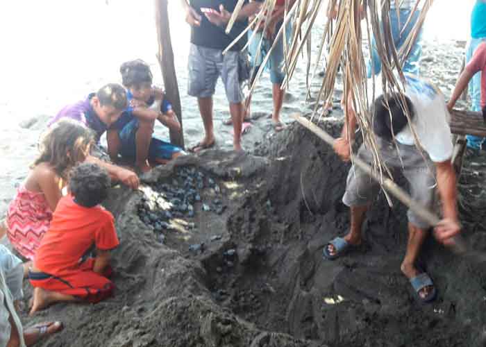 Las personas que disfrutaban de la playa en la bocana de Poneloya presenciaban las tortuguitas mientras cavaban un hoyo para protegerlas y que no fueran víctimas de los depredadores.
